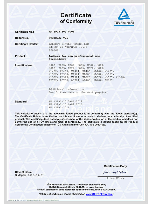 Oι σκάλες αλουμινίου της εταιρείας μας έχουν πιστοποιηθεί από τις εταιρείες EUROCERT-TÜV-RHEINLAND περνώντας ξεχωριστές δοκιμές. Η εταιρεία μας δίνει πάντα προτεραιότητα στην ποιότητα των προϊόντων με τα πιστοποιητικά ποιότητας EN 131-2-3. Προσαρμόζοντας πολύ γρήγορα στις τυπικές αλλαγές, τα προϊόντα μας κατασκευάζονται σύμφωνα με τα τρέχοντα πρότυπα.
